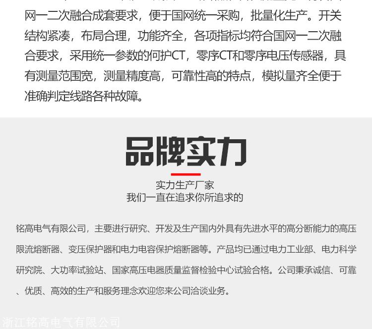 产品详情:浙江铭高电气有限公司,主要用以国内外具备高分断能力的高压熔断器的研发和生产,3.6-40.5kv线路保护和变压保护器,高压熔断器,电压互感器保护,功率电容器保护保险丝,高压保险丝,穿墙套管负载开关等高压产品,公司已通过ISO9001(2000)质量体系认证,并赢得了国家质量监督检验中心的检测证书及其他资质证书。